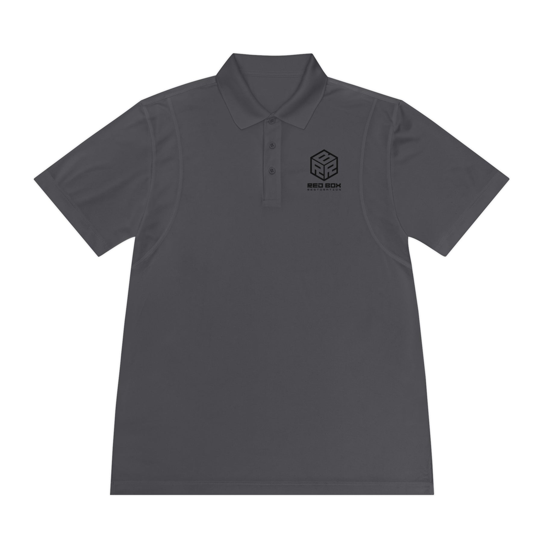 Lightweight, gray sport polo, subtle Red Box mark on the chest — nothing loud, nothing screaming “I sell timeshares.” Just clean, quiet, “Yes, I care about panel gaps and my calendar.”