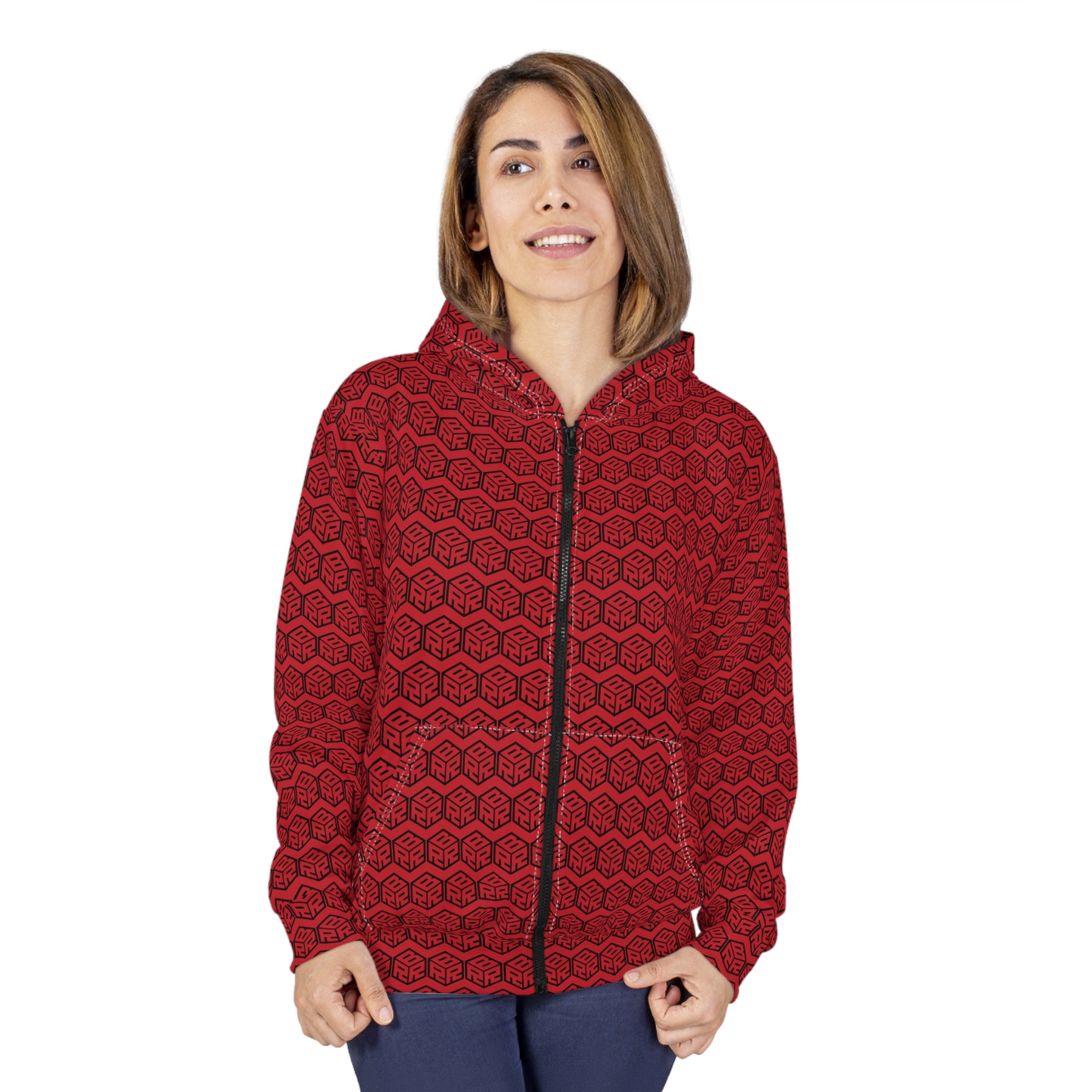 The red-and-black pattern hits hard, the color stays sharp, and the black zipper with white stitching makes it look… suspiciously put together. Front pockets for cold hands, lost keys, and that crumpled-up dyno sheet you keep showing people unprovoked. Medium weight, easy to layer, perfect for late-night drives, meet nights, or walking into Starbucks like you daily something with a wing and a cage.